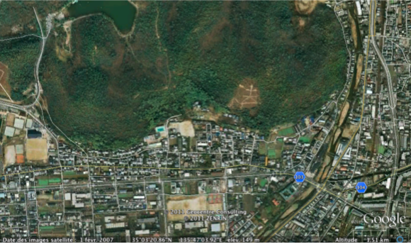 C’est un quartier neuf, qui n’existait pas il y a 15 ans. Planté sur la partie douce de la pente, au pied des collines, mais surplombant ainsi légèrement la plaine où s’étend la ville, position qui semble plaire aux jeunes cadres. Au fond de la vallée, à un kilomètre à vol d’oiseau sans doute, la rivière principale (小畑川 Obatagawa, affluent de la rivière Katsuragawa), et la route numéro 9, à quatre voies , interrégionale. De gros pavillons de banlieue moches, clinquants, prétentiards, avec leurs deux grosses bagnoles plantées devant, un 4x4 de 300Cv ou plus, et la mini de madame. Tout cela au pays des « accords de Kyôto ».